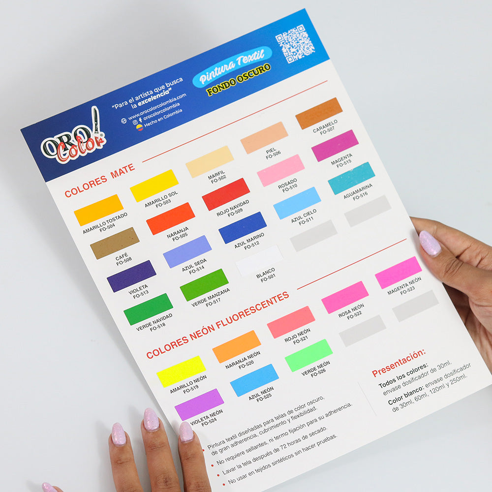 Descubre nuestraCarta de Colores Pintura para Tela Fondo Oscuro, cuidadosamente elaborada y pintada a mano para ofrecer una representación 100% real del acabado final de nuestras pinturas.