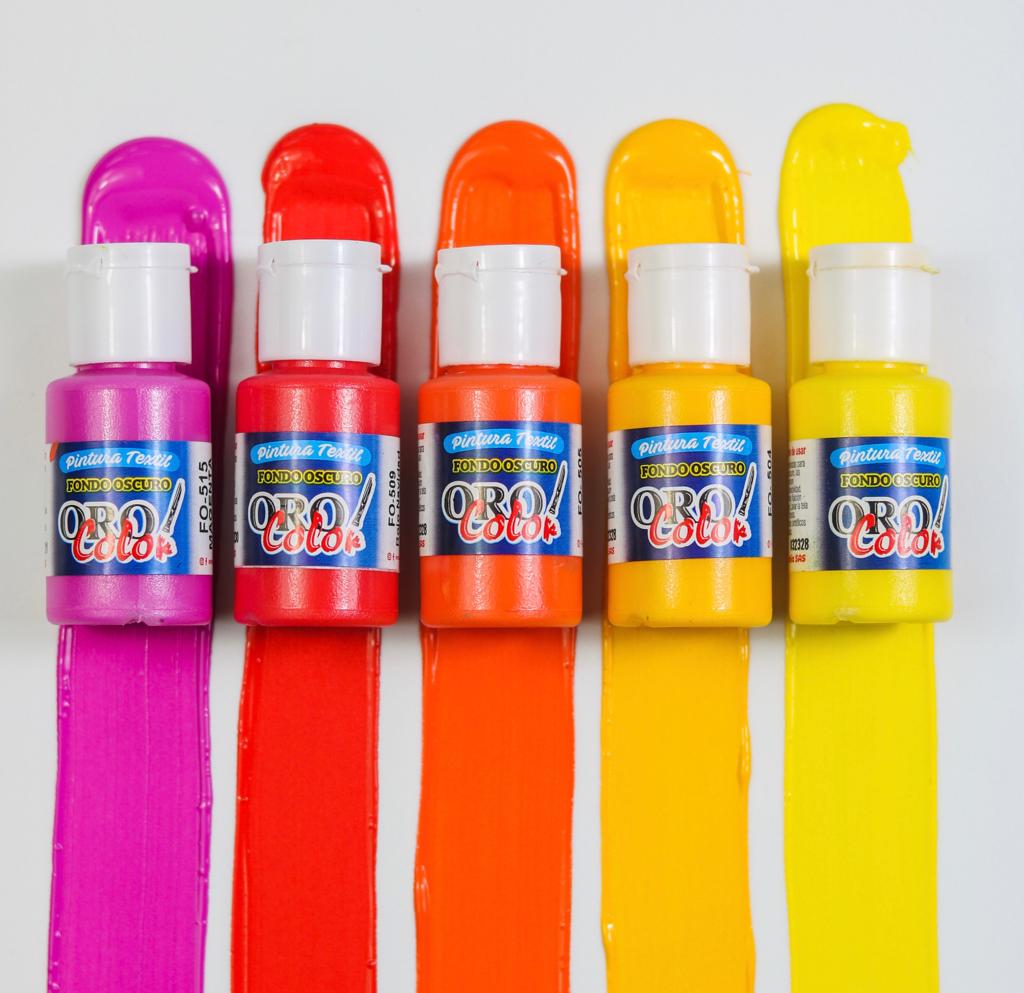 Todos los 26 colores de nuestra linea de pintura para tela fondo oscuro en presentación de 30 ml